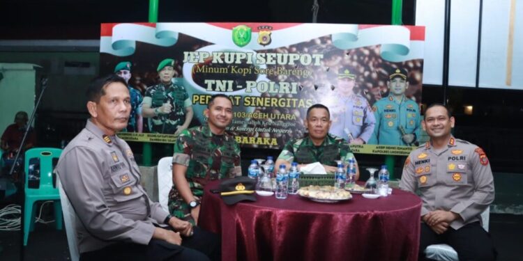 Lhokseumawe – Perkuat Sinergitas sejumlah pejabat TNI-Polri gelar program Jep Kupi (Ngopi bareng) yang berlangsung di Kodim 0103/ Aceh Utara, Jalan Iskandar Muda Desa Kampung Jawa Lama Kecamatan Banda Sakti Kota Lhokseumawe, Selasa (2/4/2023) malam.