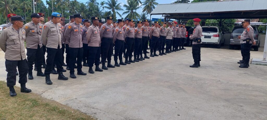 LHOKSEUMAWE – Puluhan personel gabungan dari Kepolisian ikuti apel kesiapsiagaan Pam TPS Pemilu di Mapolsek Samudera, Polres Lhokseumawe, apel tersebut diikuti Pamatwil untuk wilayah timur Polres Lhokseumawe, AKP Wijaya Yudi Stira P, Senin (12/2/2024).