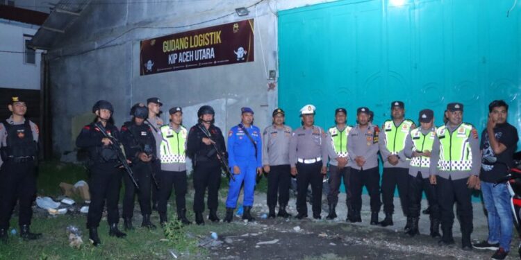 LHOKSEUMAWE – Personel gabungan Polres Lhokseumawe meningkatkan patroli di gudang logistik menjelang Pemilu Serentak 2024 di wilayah hukum Polres Lhokseumawe, Kamis (14/12/2023).