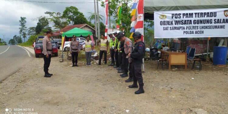 LHOKSEUMAWE – Personel Pam wisata Gunung Salak, Aceh Utara, wilayah hukum Polres Lhokseumawe melaksanakan apel dan patroli rutin di sepanjang jalur tersebut, Jumat (28/4/2023).