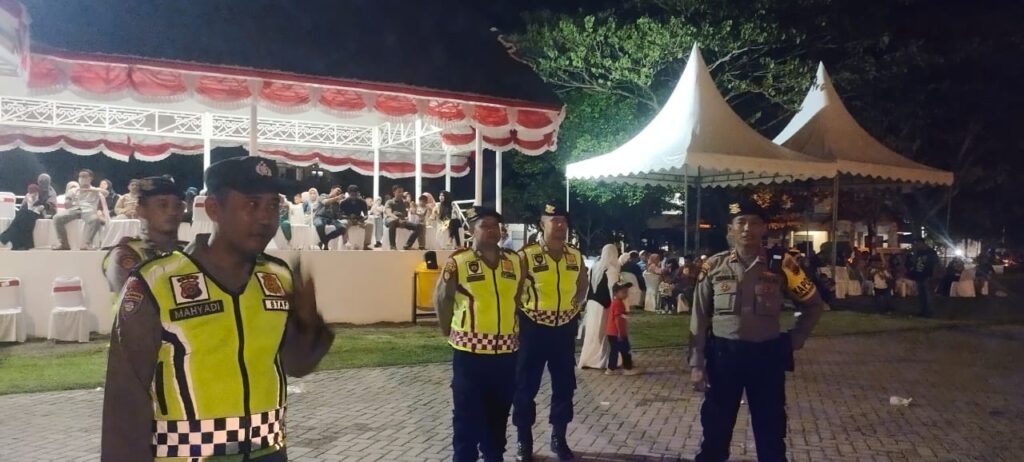 LHOKSEUMAWE – Personel gabungan Polres Lhokseumawe melaksanakan pengamanan pada kegiatan Sarasehan UMKM Korwil I Apeksi di Lapangan Hiraq, Kecamatan Banda Sakti, Kota Lhokseumawe, Minggu (18/11/2023) malam.