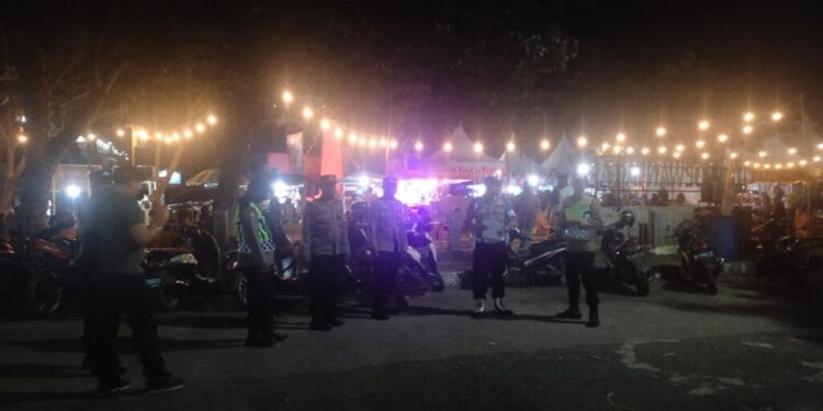 LHOKSEUMAWE – Personel Polres Lhokseumawe melakukan pengamanan kampanye calon legislatif (caleg) Partai Aceh yang berlangsung di sekitar Tugu Bujang Salim, Kec. Dewantara, Kab. Aceh Utara, Senin (13/1/2024) malam.