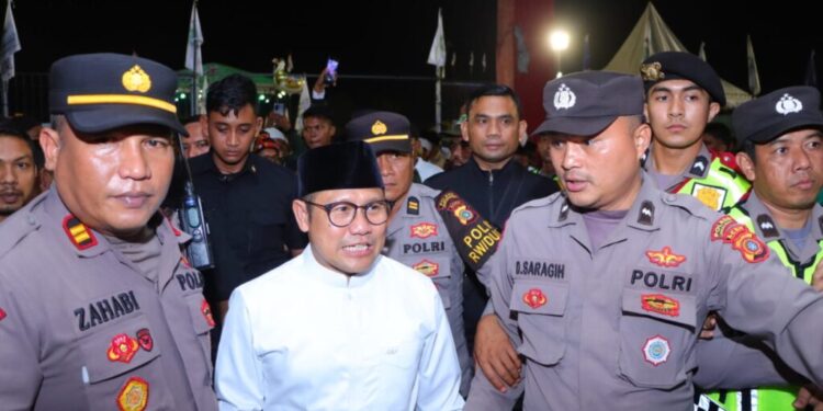 LHOKSEUMAWE – Puluhan personel Polres Lhokseumawe melakukan pengamanan kegiatan kampanye Cawapres Nomor Urut 1, Muhaimin Iskandar di Stadion Krueng Mane, Kecamatan Muara Batu, Aceh Utara, wilayah hukum Polres Lhokseumawe, Selasa (5/12/2023) malam.