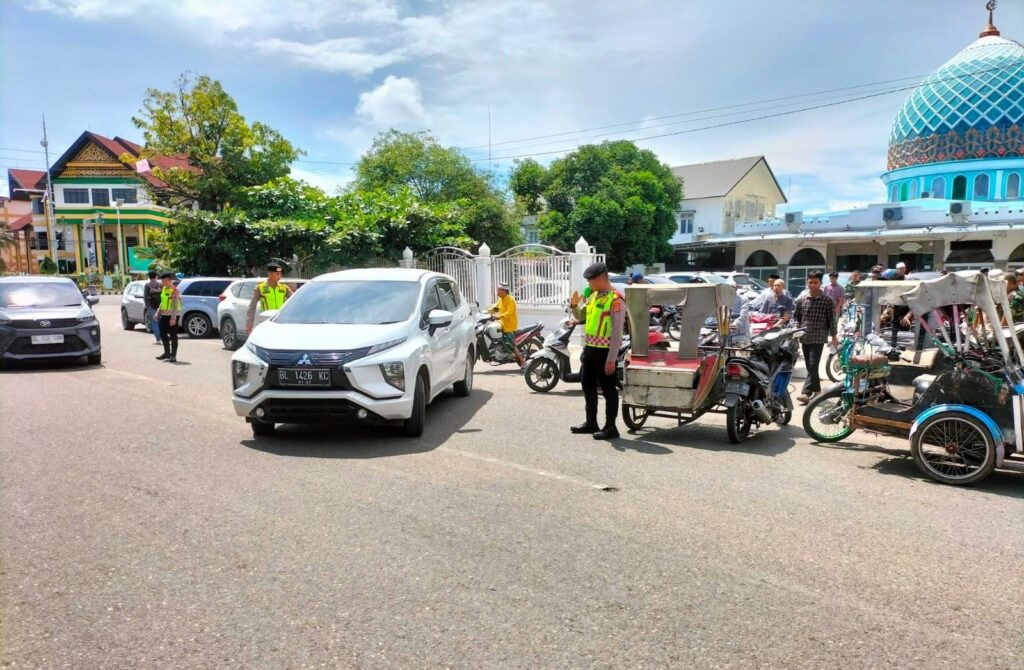 LHOKSEUMAWE – Personel Sat Samapta Polres Lhokseumawe memberi pelayanan kepada para jamaah ibadah shalat Jumat di depan Masjid Jamik, Kota Lhokseumawe, Jumat (8/12/2023) siang.