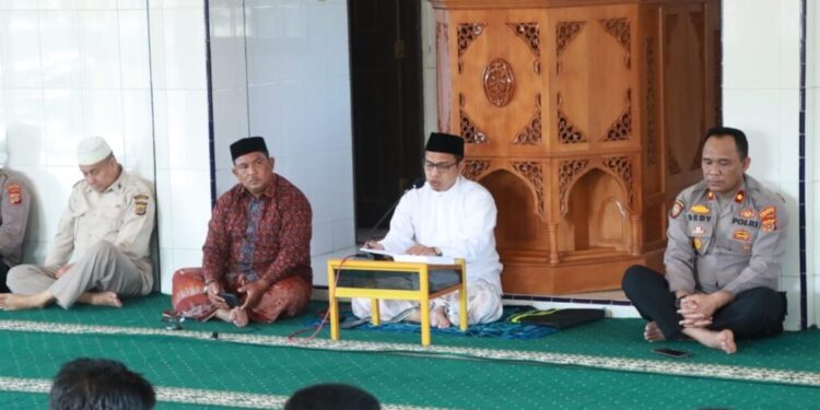 LHOKSEUMAWE – Personel Polres Lhokseumawe mengikuti pengajian di Masjid Babuttaqwa Mapolres Lhokseumawe, Kamis (27/7/2023).