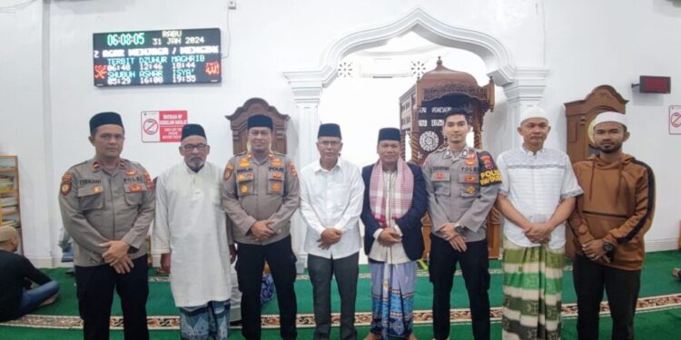LHOKSEUMAWE – Personel Polres Lhokseumawe melaksanakan kegiatan subuh keliling di Masjid Jamik, Lancang Garam, Kecamatan Banda Sakti, Kota Lhokseumawe, Rabu (31/1/2024) pagi.