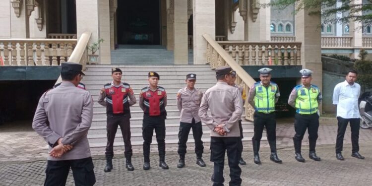 LHOKSEUMAWE – Personel gabungan Polres Lhokseumawe melakukan pengamanan pada acara uji mampu baca Al Qur’an bagi para bakal calon legislatif (bacaleg) DPRK di Masjid Islamic Center Lhokseumawe, Rabu (7/6/2023).