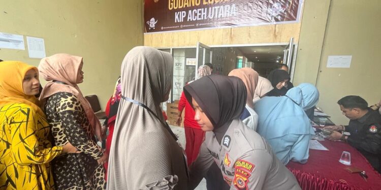 Pantauan di lapangan, tampak personel melakukan pemeriksaan badan terhadap petugas yang akan memasuki gudang logistik KIP Aceh Utara.