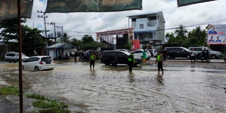 LHOKSEUMAWE – Personel Sat Samapta Polres Lhokseumawe melakukan pengaturan lalu lintas di lokasi banjir, jalan Medan – Banda Aceh di wilayah hukum Polres Lhokseumawe, Senin (25/12/2033).