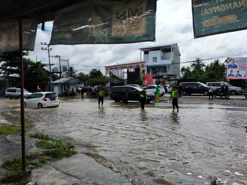 LHOKSEUMAWE – Personel Sat Samapta Polres Lhokseumawe melakukan pengaturan lalu lintas di lokasi banjir, jalan Medan – Banda Aceh di wilayah hukum Polres Lhokseumawe, Senin (25/12/2033).