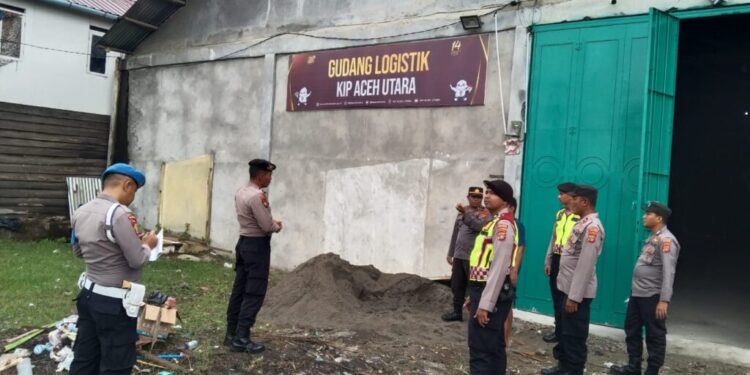 LHOKSEUMAWE – Personel Sat Samapta Polres Lhokseumawe melaksanakan patroli dan mengecek gudang logistik Pemilu KIP Kota Lhokseumawe dan KIP Aceh Utara, Kamis (19/10/2023).