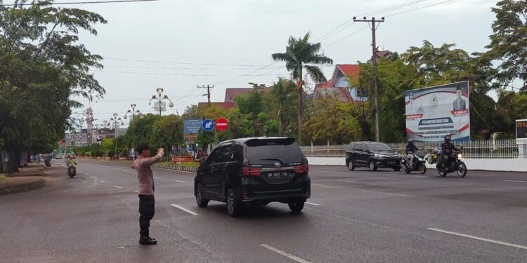 LHOKSEUMAWE – Personel Polsek Banda Sakti mengatur arus lalu lintas di Simpang BTN, Kota Lhokseumawe, Rabu (1/3/2023), kegiatan tersebut guna memberikan pelayanan kepada para pengguna jalan raya di pagi hari.