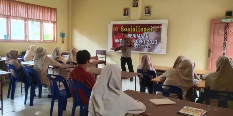 LHOKSEUMAWE – Personel Polsek Banda Sakti, Polres Lhokseumawe melaksanakan kegiatan sosialiasi penerimaan Polri Tahun 2023 kepada siswa SMK Negeri 2 Lhokseumawe, Rabu (12/4/2023) pagi.