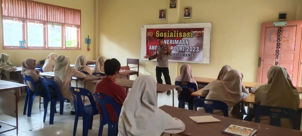 LHOKSEUMAWE – Personel Polsek Banda Sakti, Polres Lhokseumawe melaksanakan kegiatan sosialiasi penerimaan Polri Tahun 2023 kepada siswa SMK Negeri 2 Lhokseumawe, Rabu (12/4/2023) pagi.