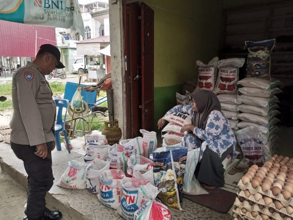 LHOKSEUMAWE – Personel Polsek Blang Mangat melakukan monitoring persediaan sembako ke sejumlah pedagang di pasar Keude Punteut, Kecamatan Blang Mangat, Kota Lhokseumawe, Senin (17/4/2023).