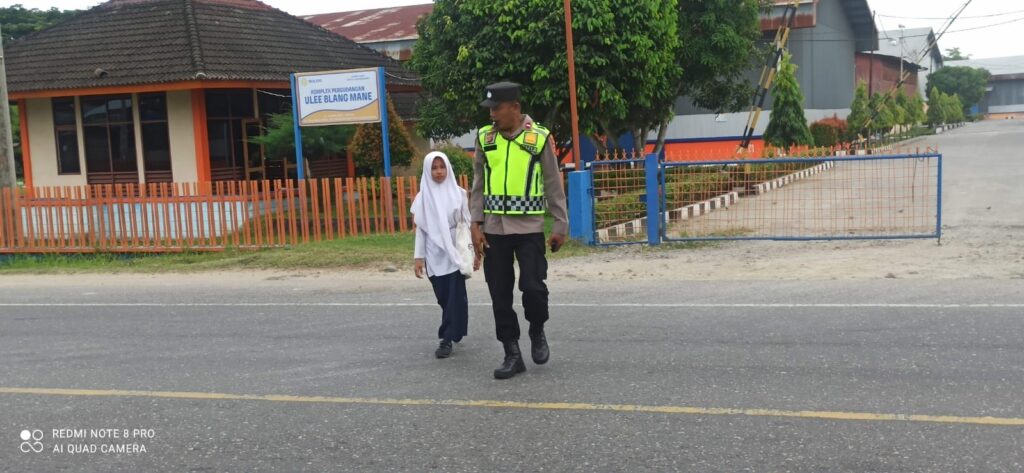 LHOKSEUMAWE – Personel Polsek Blang Mangat melaksanakan strong poin atau pengaturan lalu lintas di jalan lintas Medan – Banda Aceh tepatnya di depan sekolah SMP Negeri 11 Blang Mangat, Kota Lhokseumawe, Selasa (3/10/2023) pagi.