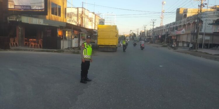 LHOKSEUMAWE – Personel Polsek Blang Mangat melaksanakan strong poin atau pengaturan lalu lintad di jalan lintas Medan – Banda Aceh tepatnya di titik penggal Keude Punteut, Kecamatan Blang Mangat, Kota Lhokseumawe, Rabu (12/7/2023) pagi.