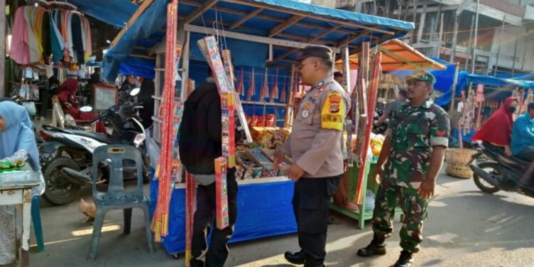 LHOKSEUMAWE – Personel Polsek Blang Mangat bersama TNI melakukan patroli dan mengimbau pedagang kembang api di Keude Punteut, Kecamatan Blang Mangat, Kota Lhokseumawe agar tidak menjual petasan, Rabu (29/3/2023).