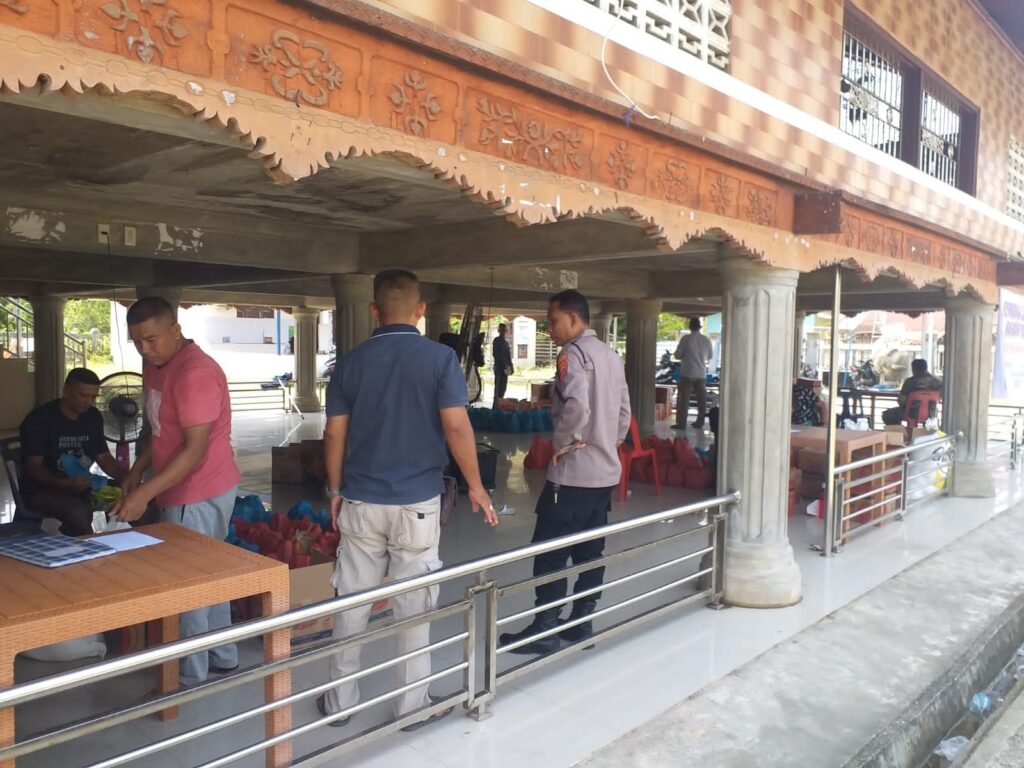 LHOKSEUMAWE – Personel Polsek Blang Mangat mengawal proses penyaluran bantuan bahan pangan atau sembako kepada warga miskin di Gampong Blang Cut, Kecamatan Blang Mangat, Kota Lhokseumawe, Minggu (16/4/2023).
