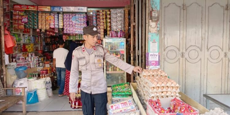 LHOKSEUMAWE – Personel Polsek Blang Mangat kembali memantau stabilitas stok sembako di pasar tradisional maupun toko kelontong di Keude Punteut, Kecamatan Blang Mangat, Kota Lhokseumawe, Senin (10/4/2023).
