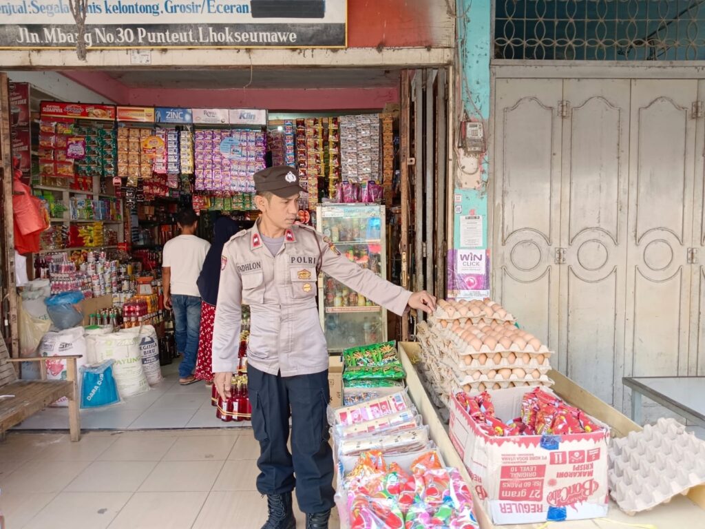 LHOKSEUMAWE – Personel Polsek Blang Mangat kembali memantau stabilitas stok sembako di pasar tradisional maupun toko kelontong di Keude Punteut, Kecamatan Blang Mangat, Kota Lhokseumawe, Senin (10/4/2023).