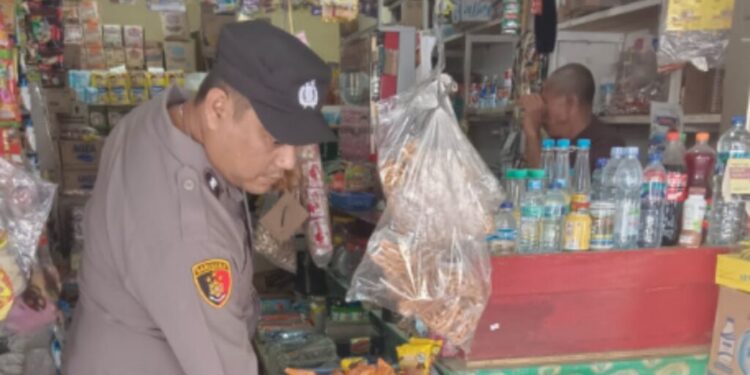 LHOKSEUMAWE – Personel Polsek Blang Mangat kembali turun ke pasar tradisional dan kedai kelontong di kecamatan Blang Mangat, Kota Lhokseumawe untuk memantau stok sembako, Selasa (7/2/2023).
