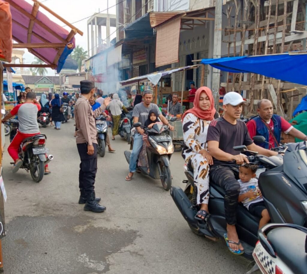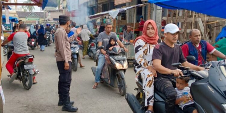LHOKSEUMAWE – Personel Polsek Blang Mangat melakukan pengamanan dan pengaturan lalu lintas menjelang waktu berbuka puasa di Keude Punteut, Kecamatan Blang Mangat, Kota Lhokseumawe, kegiatan ini untuk mencegah kemacetan, Sabtu (1/4/2023) sore.