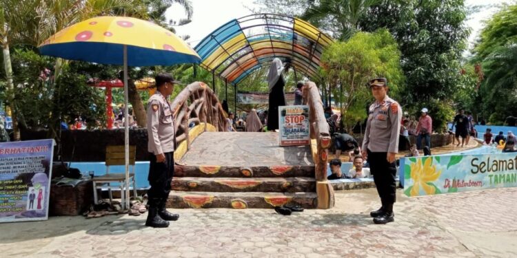 LHOKSEUMAWE – Personel Polsek Blang Mangat melaksanakan patroli di lokasi wisata Water Boom Mangat Ceria, Kecamatan Blang Mangat, Kota Lhokseumawe, Kamis (27/4/2023).