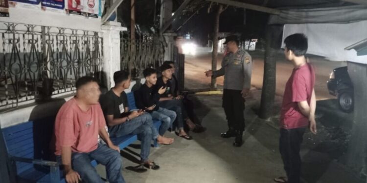 LHOKSEUMAWE- Personel Polsek Blang Mangat melaksanakan patroli rutin antisipasi gangguan Kamtibmas dan menyambagi warga di Desa Blang Teu dan Masjid Punteut, Kecamatan Blang Mangat, Kota Lhokseumawe, Minggu (9/7/2023) malam.