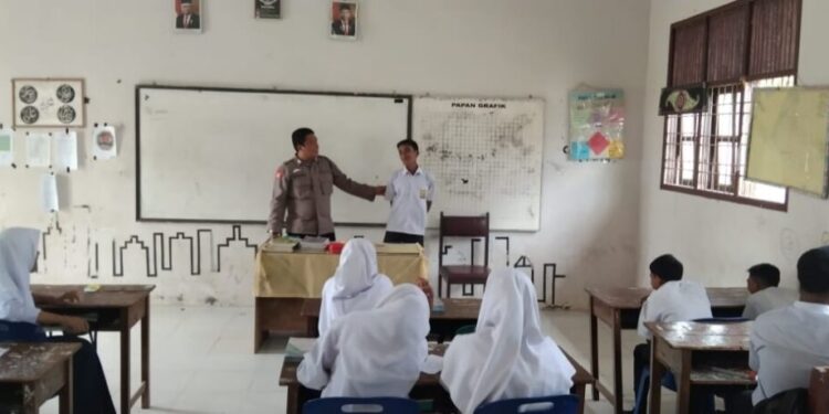 LHOKSEUMAWE – Personel Polsek Blang Mangat melaksanakan sosialisasi tentang dampak kenakalan remaja di SMP Negeri 11 Blang Mangat, Kota Lhokseumawe, Selasa (16/5/2023).