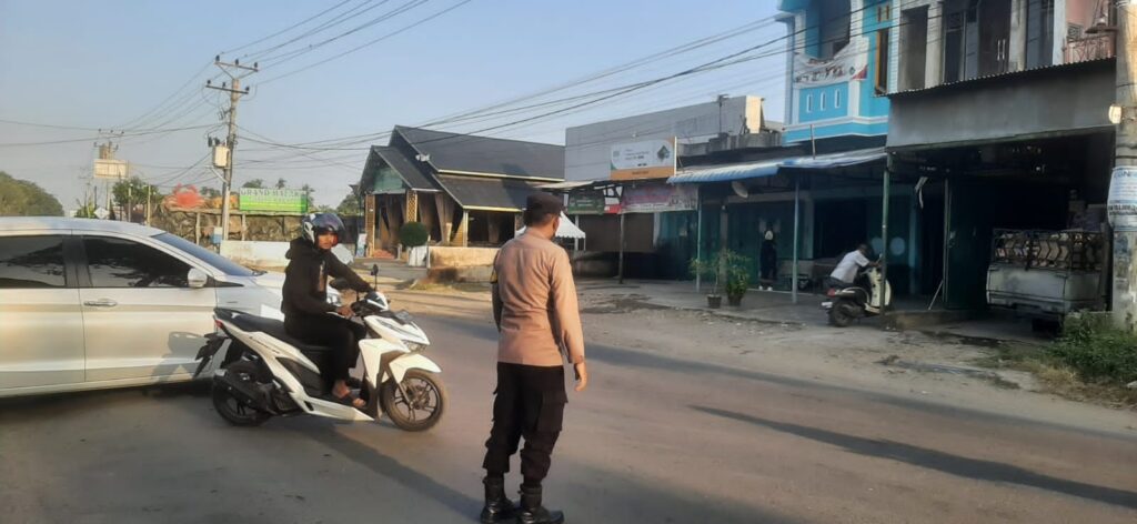 LHOKSEUMAWE – Personel Polsek Dewantara memberikan pelayanan kepada pengguna jalan raya di pagi hari di Simpang IV Keude Krueng Geukueh, Dewantara, Aceh Utara, wilayah hukum Polres Lhokseumawe, Selasa (7/3/2023).