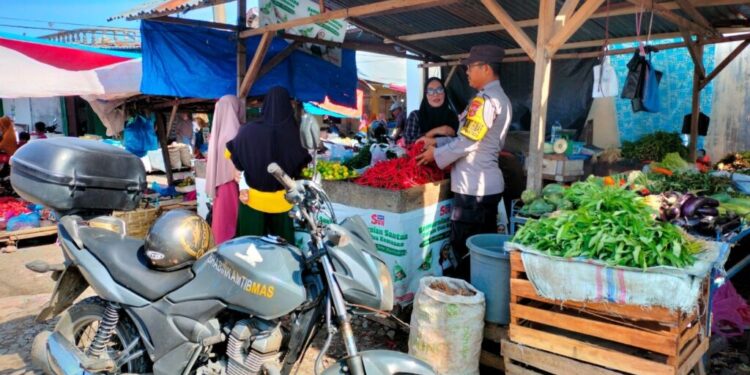 LHOKSEUMAWE – Personel Polsek Dewantara melakukan monitoring stok beras dan sayuran di pasar Keude Krueng Geukueh, Kecamatan Dewantara, Aceh Utara, wilayah hukum Polres Lhokseumawe, Minggu (12/2/2023).
