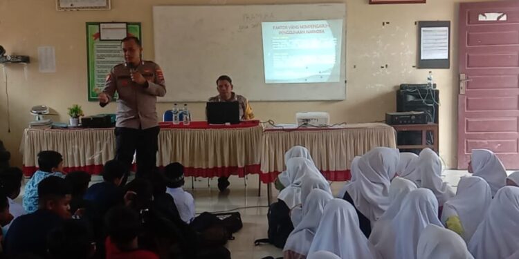 LHOKSEUMAWE – Personel Polsek kuta Makmur, memberikan sosialisasi tentang bahaya Narkoba kepada para siswa SMP Negeri 1 Kuta Makmur, Aceh Utara, wilayah hukum Polres Lhokseumawe, Kamis (20/7/2023) pagi.