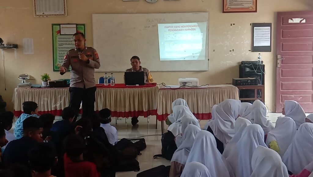LHOKSEUMAWE – Personel Polsek kuta Makmur, memberikan sosialisasi tentang bahaya Narkoba kepada para siswa SMP Negeri 1 Kuta Makmur, Aceh Utara, wilayah hukum Polres Lhokseumawe, Kamis (20/7/2023) pagi.