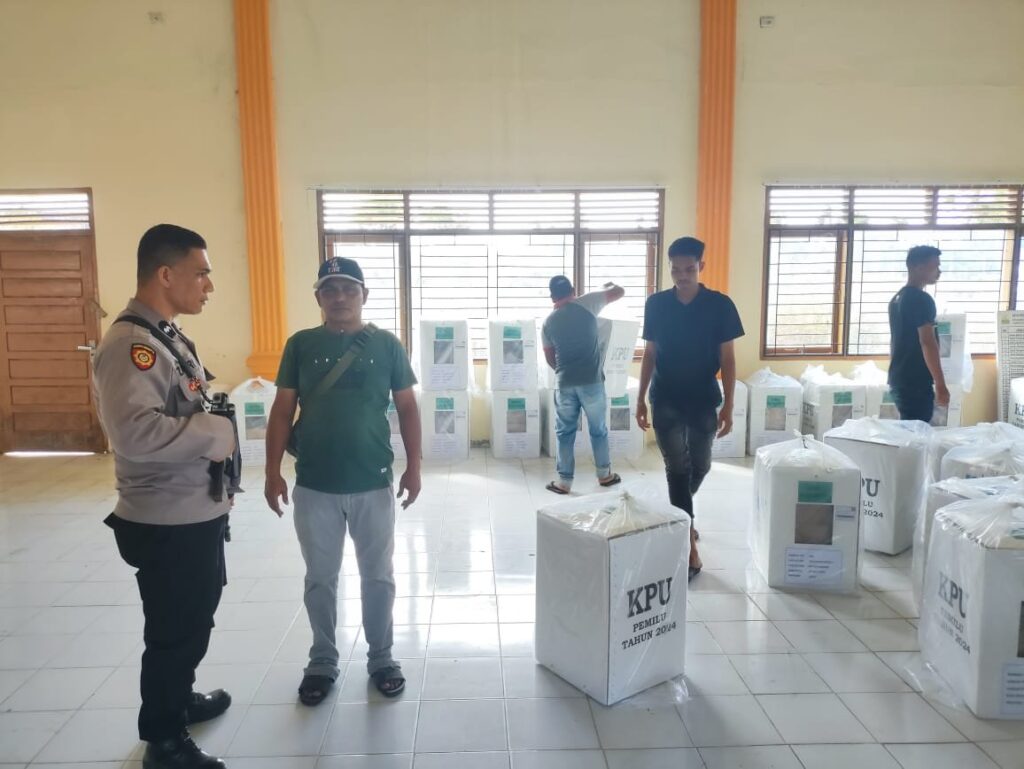 LHOKSEUMAWE – Personel personel Polsek Kuta Makmur melakukan pengamanan dan pengecekan logistik pemilu di sekretariat PPK Kuta Makmur, Aceh Utara, wilayah hukum Polres Lhokseumawe, Minggu (11/2/2024).