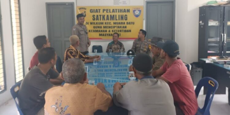 LHOKSEUMAWE – Personel Polsek Muara Batu memberikan pelatihan kepada anggota Satkamling, kegiatan tersebut berlangsung di kantor Keuchik Gamping Pante Gurah, Kecamatan Muara Batu, Aceh Utara, wilayah hukum Polres Lhokseumawe, Kamis (27/7/2023).