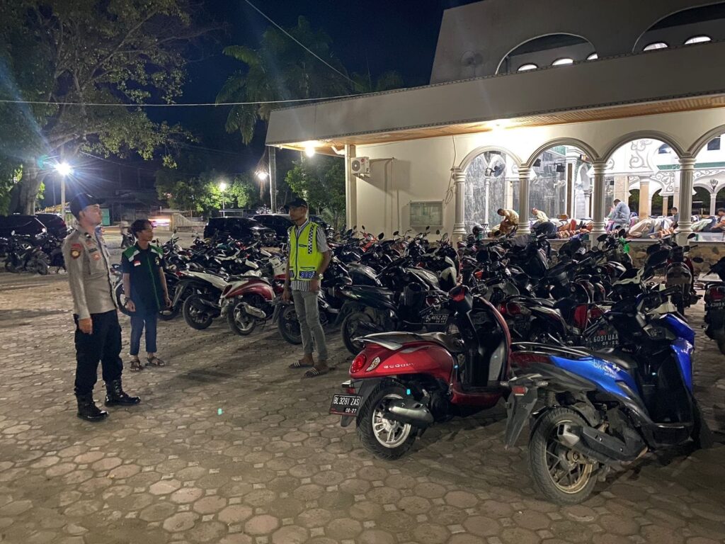LHOKSEUMAWE – Personel Polsek Muara Batu melakukan pengamanan shalat tarawih dan menjaga kendaraan jemaah di Masjid Jamik Al Izzah, Kecamatan Muara Batu, Aceh Utara, wilayah hukum Polres Lhokseumawe, Kamis (6/4/2023) malam.