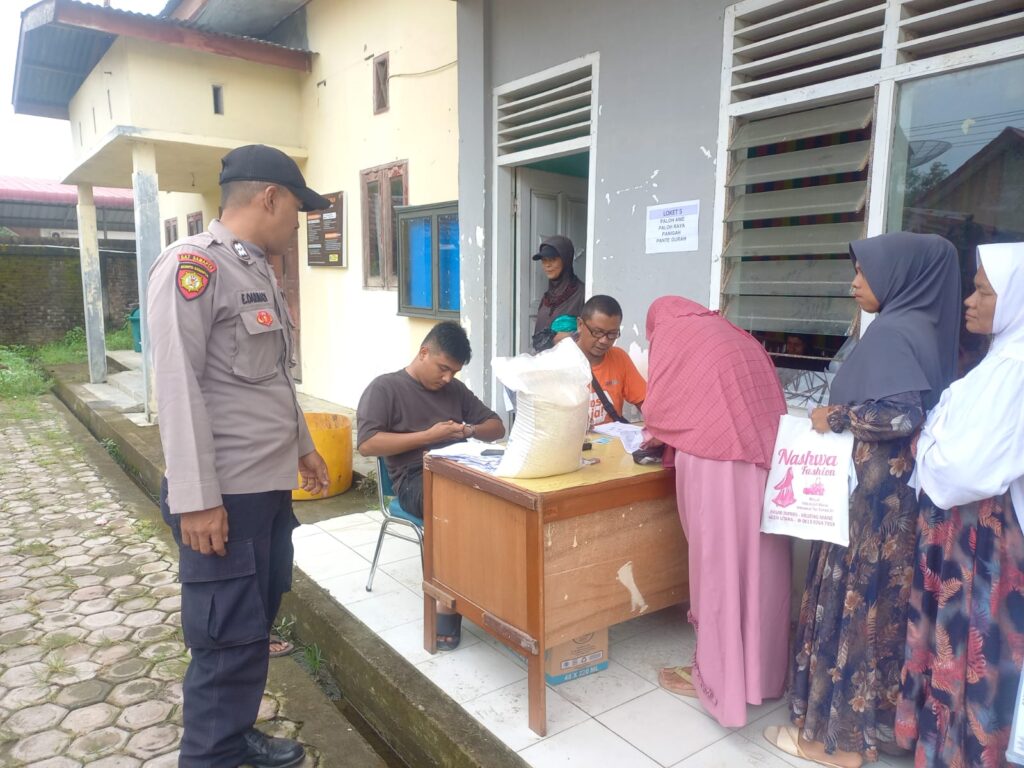 LHOKSEUMAWE – Personel Polsek Muara Batu mengawal proses penyaluran Bantuan Pangan Beras Cadangan Pemerintah (BP-BCP) Tahap 6 tahun 2023 di aula kantor camat Muara Batu, Aceh Utara, wilayah hukum Polres Lhokseumawe, Minggu (12/11/2023).