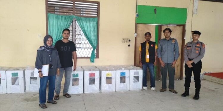 LHOKSEUMAWE – Personel Polsek Muara Dua dan Pam TPS Polres Lhokseumawe mengawal pergeseran kotak dan surat suara hasil Pemilu 2024 dari TPS ke sekretariat PPK Muara Dua, Kota Lhokseumawe, Kamis (15/2/2024).