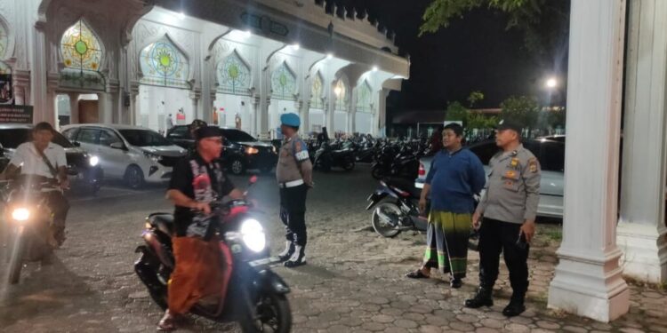 LHOKSEUMAWE – Personel Polsek Muara Dua melaksanakan pengamanan ibadah shalat Isya dan tarawih di Masjid Al Hikmah, Cunda, Kecamatan Muara Dua, Kota Lhokseumawe, Senin (3/4/2023) malam.