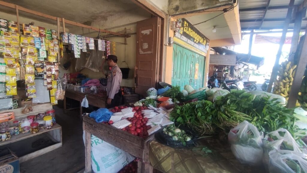 LHOKSEUMAWE – Personel Polsek Nisam, Polres Lhokseumawe monitoring stok sembako di pasar Gampong Barat, Kecamatan Nisam, Aceh Utara, wilayah hukum Polres Lhokseumawe, Minggu (11/6/2023).