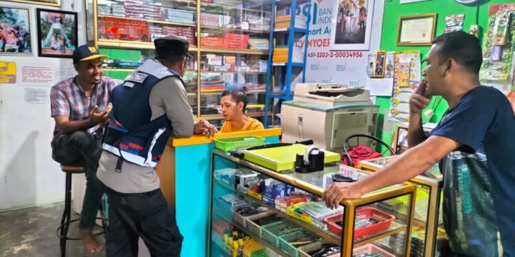 LHOKSEUMAWE – Personel Polsek Nisam, Polres Lhokseumawe melaksanakan patroli antisipasi gangguan Kamtibmas, dalam kegiatan ini personel menyambagi pedagang di Kecamatan Nisam, Aceh Utara wilayah hukum Polres Lhokseumawe, Selasa (7/11/2023) malam.