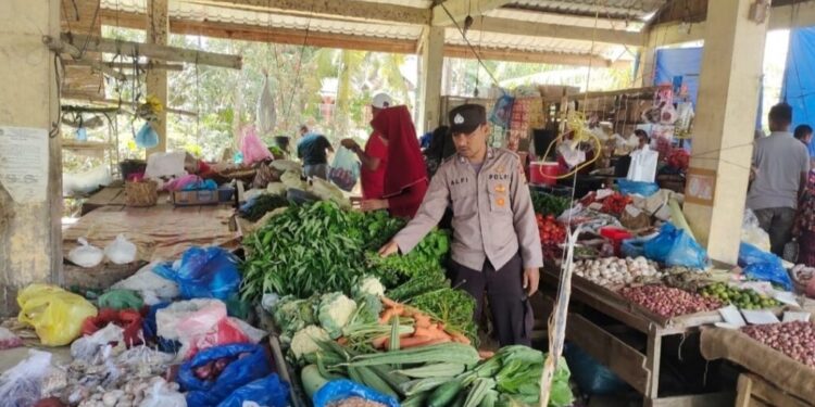 LHOKSEUMAWE – Personel Polsek Nisam menemui pedagang di pasar Gampong Meucat, Kecamatan Nisam, Aceh Utara, wilayah hukum Polres Lhokseumawe, Senin (17/7/2023).