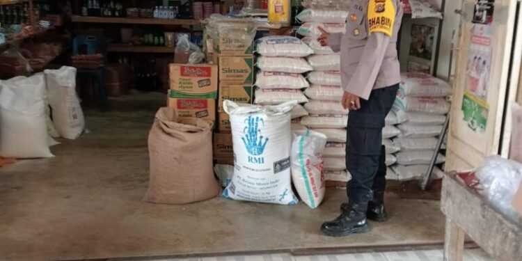 LHOKSEUMAWE – Personel Polsek Samudera monitoring stok beras dan barang sembako lainnya di kedai kelontong di Keude Geudong, Aceh Utara, wilayah hukum Polres Lhokseumawe, Minggu (17/12/2023).