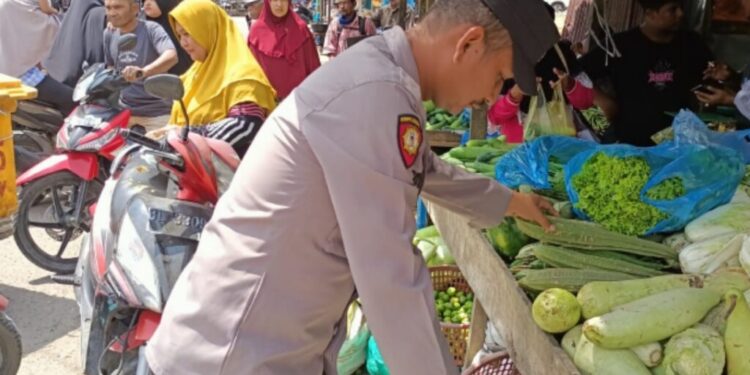 LHOKSEUMAWE – Personel Polsek Samudera memantau persediaan sayuran di pasar Keude Geudong, Kecamatan Samudera, Aceh Utara, wilayah hukum Polres Lhokseumawe, Jumat (16/6/2023).