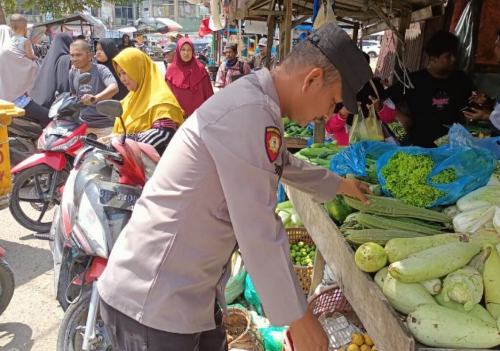 LHOKSEUMAWE – Personel Polsek Samudera memantau persediaan sayuran di pasar Keude Geudong, Kecamatan Samudera, Aceh Utara, wilayah hukum Polres Lhokseumawe, Jumat (16/6/2023).