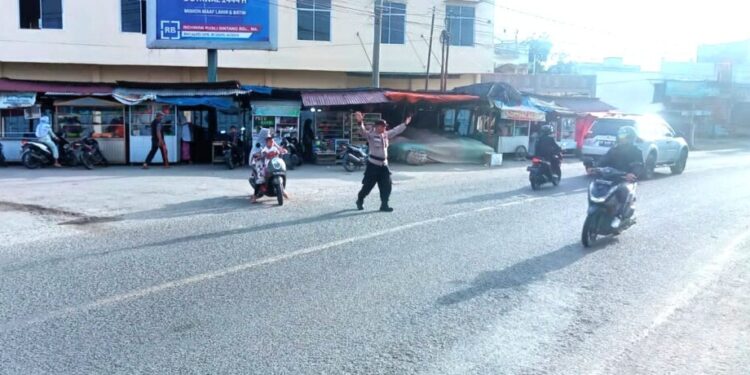 LHOKSEUMAWE – Peduli dengan keselamatan pengendara di jalan raya, Personel Polsek Samudera melaksanakan strong poin di persimpangan Keude Geudong, Samudera, Aceh Utara, wilayah hukum Polres Lhokseumawe, Senin (19/6/2023) pagi.