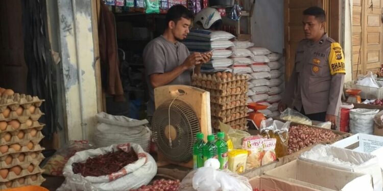 LHOKSEUMAWE – Personel Polsek Samudera kembali menyambagi sejumlah pedagang di pasar tradisional dan toko kelontong di Kecamatan Samudera Aceh Utara, wilayah hukum Polres Lhokseumawe, Kamis (2/2/2023).