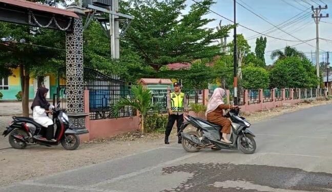 LHOKSEUMAWE – Personel Polsek Sawang melakukan strong poin atau pengaturan lalu lintas di SP. Jalan Pendidikan, Aceh Utara, wilayah hukum Polres Lhokseumawe, Senin (9/9/2024) pagi.