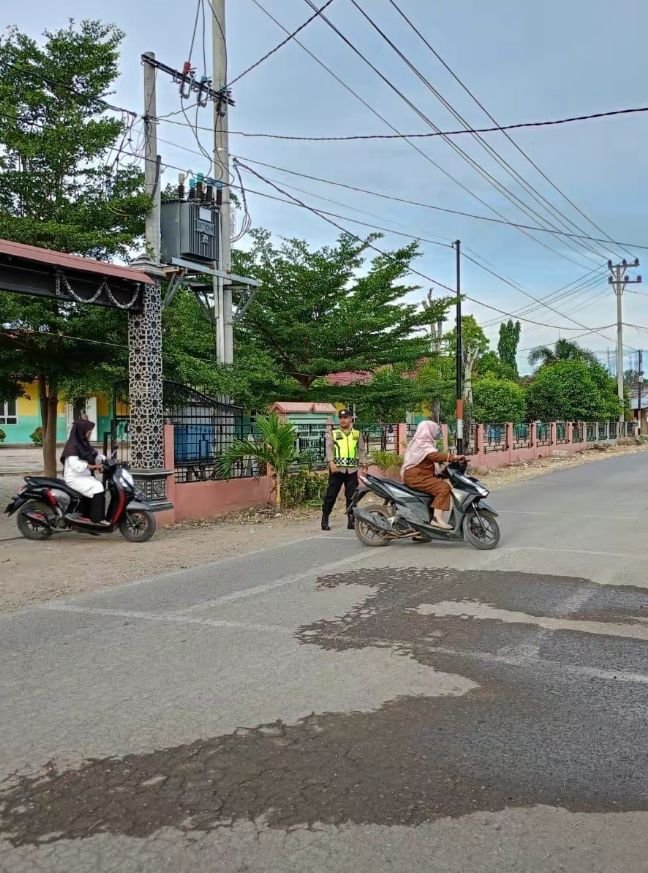 LHOKSEUMAWE – Personel Polsek Sawang melakukan strong poin atau pengaturan lalu lintas di SP. Jalan Pendidikan, Aceh Utara, wilayah hukum Polres Lhokseumawe, Senin (9/9/2024) pagi.